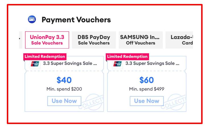 Voucher Types 1. Lazada 3.3 voucher: S$40 off min. spend S$200. 2. Lazada 3.3 voucher: S$60 off min. spend S$499.