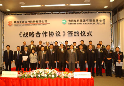 The cooperation between ICBC and Datong Coal implied the joining forces of China largest commercial bank and a Coal Conglomerate. This will create a significant and active impact on the development of China coal industry, promoting strategic structural adjustment to coal enterprises and construction of an industrial base dedicated to new types of energy resources.